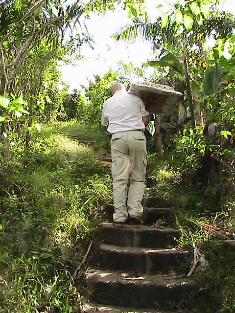 The journey to the first village was uneventful for Laura and I except for the start; we stopped at the local pasteleria (cake baker) to pick up the two cakes for the two schools. Simple enough task, except these two cakes were large enough to land planes on, built up two layers high and beautifully decorated; supported by two large trays but no boxes. Now most of you would see this as absurd, transporting two large cakes, in the back of a car, through Dominican traffic, up windy gravel roads, muddy in many spots, to the first village of Paraiso; but we did it! The journey to the second village of Nazareth was different though; even though it should have been a five minute drive not far from Paraiso it turns out trials must be endured. Rounding the final corner to the entrance to the village of Nazareth we cam across a man who was digging several trenches across the road for water lines to the houses which surrounded the area. The road was impassable as the trenches were numerous and deep running right across the road; good thing there was another way into Nazareth. Our caravan turned around and headed back down to the main road (about 4 miles down and around a hill through several small villages and back up another muddy road which incidentally joins the road we had been on when we discovered the ditch digger.) Confused? Rounding a bend in the road we encountered yet another crew working on the other side of the entrance to Nazareth, digging a large trench right down the middle of the road, this time with a backhoe. Now normally this would not seem to be a problem however, two construction digs on either side of the main entrance to Nazareth (the only entrance) blocked all passage into the village by car. Hmmmm....we could see the village across the valley but could not get there. I jumped on the phone to call Josie and explain our predicament, she informed me that there was one more way to get up into Nazareth. So Laura and I jumped into the car, turned around and headed back down and around the mountain yet again, continuing around through to another village which was located in another valley, directly below the village of Nazareth; only a few hundred feet below. We jumped out of the car and unloaded our last cake which I managed to perch on my shoulder, now remember, this is a cake about three feet by two feet, about 25 lbs and beautifully decorated. We followed a path through the village of Redemption, (below Nazareth) and came to a set of stairs, concrete (mostly) and winding up the hillside out of site; 122 steps to Nazareth. Good thing I had been exercising, finally we made it to the top of the stairs and meandered our way to the top of the village where the school was. Yeah! I shared this with all of you to help put a smile on your faces!